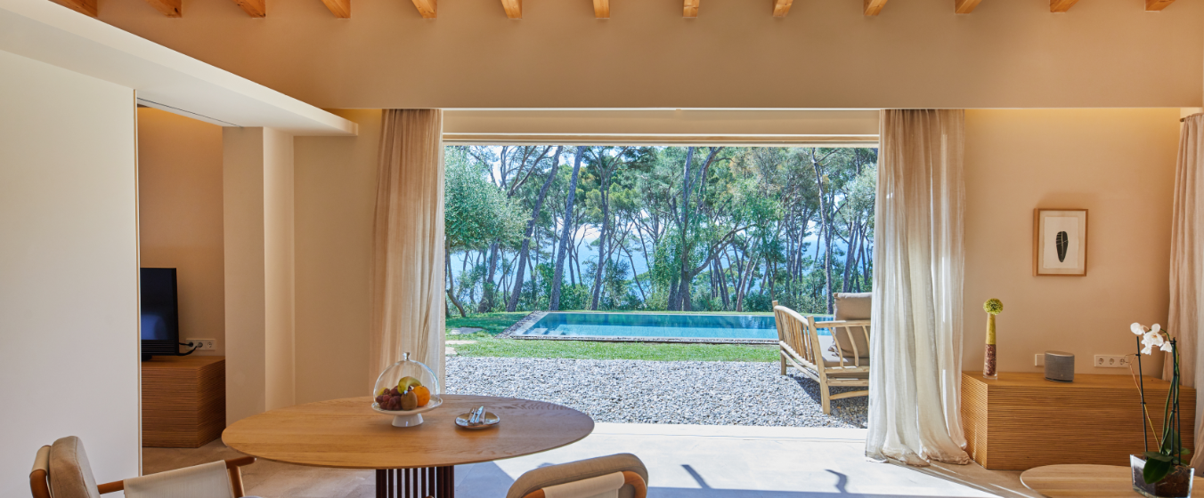 Bienestar, serenidad, armonía. Rodeadas de un bosque mediterráneo con suntuosos pinos y acebuches, todas las suites han sido creadas respetando al máximo la naturaleza Puro diseño interior con mobiliario exclusivo de madera natural y tela, combinado con piezas de arte que reflejan los valores del entorno privilegiado. La excepcional amplitud de las habitaciones se prolonga en dos patios interiores y en una confortable terraza exterior. Privacidad, instalaciones de la más alta calidad y confort absoluto. Experimente el retorno a la esencia de nuestra Tierra, a la relajación en medio de la naturaleza